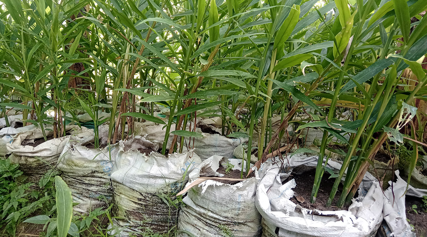 নীলফামারীতে পতিত জমিতে বস্তায় আদা চাষ করে বাড়তি আয় করছেন কৃষক